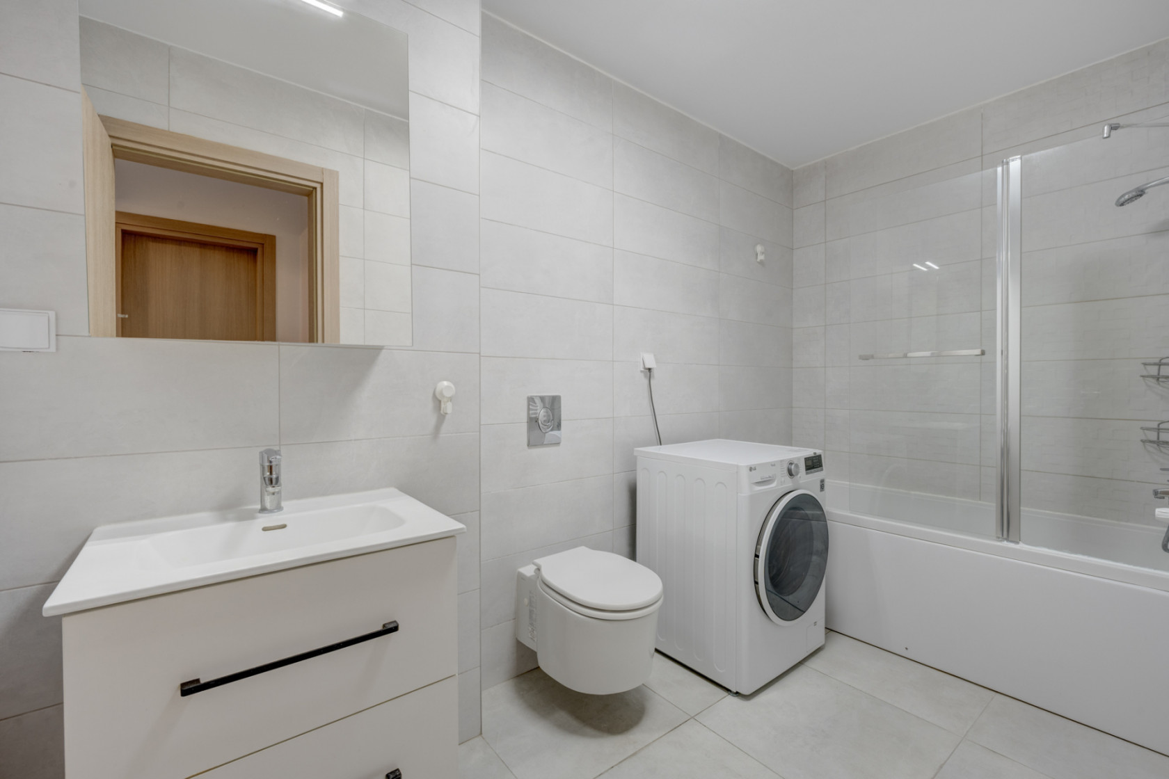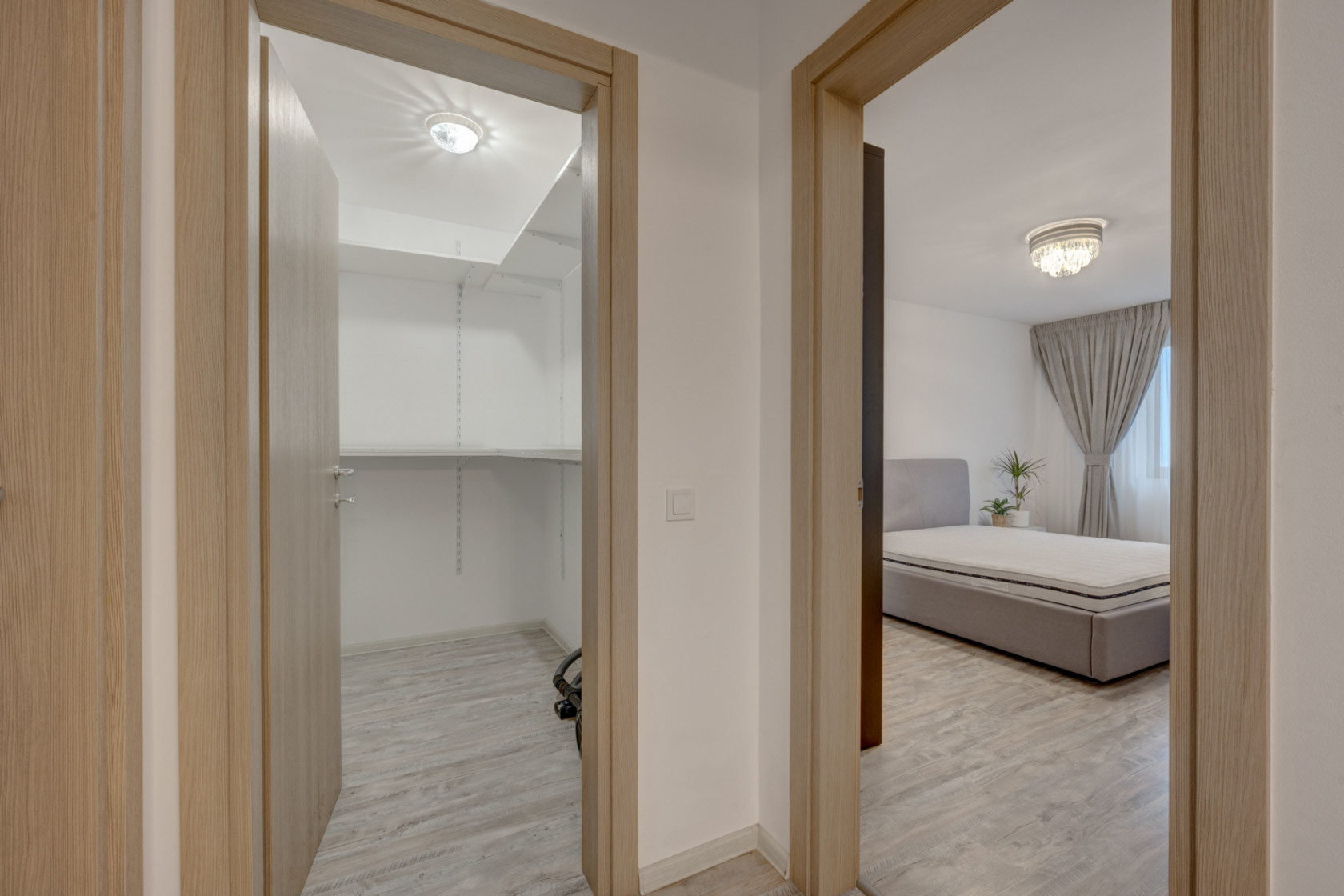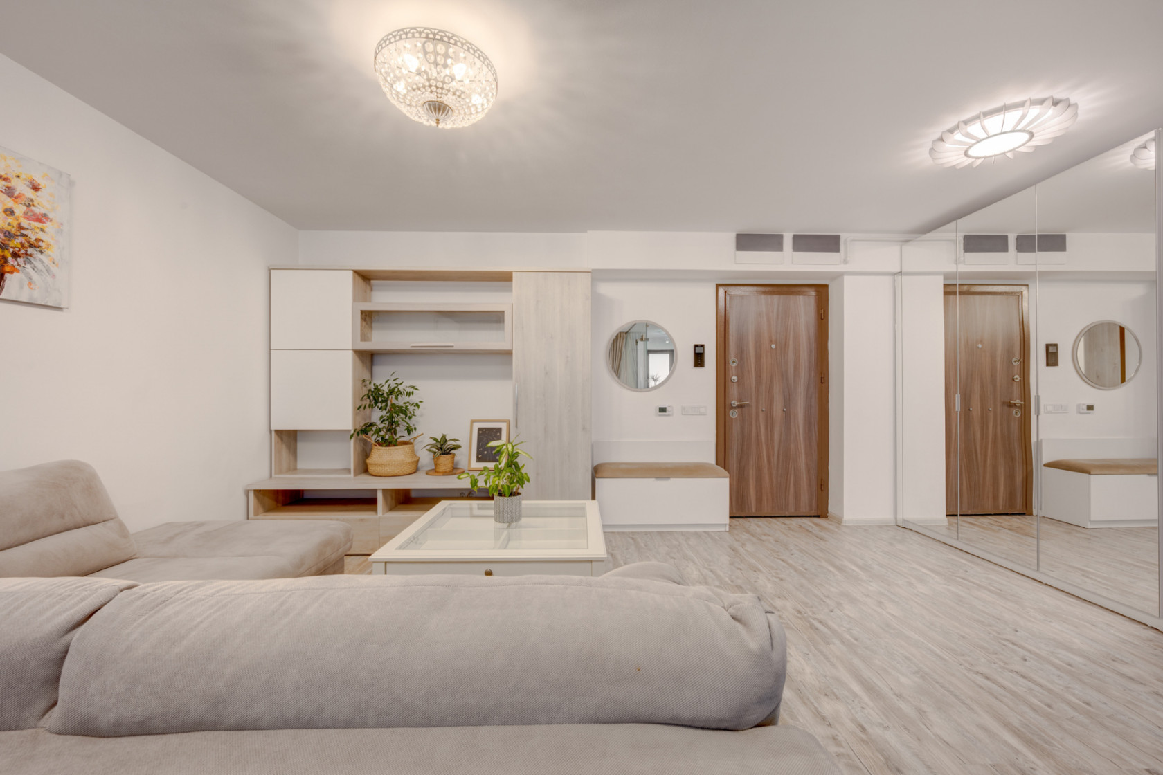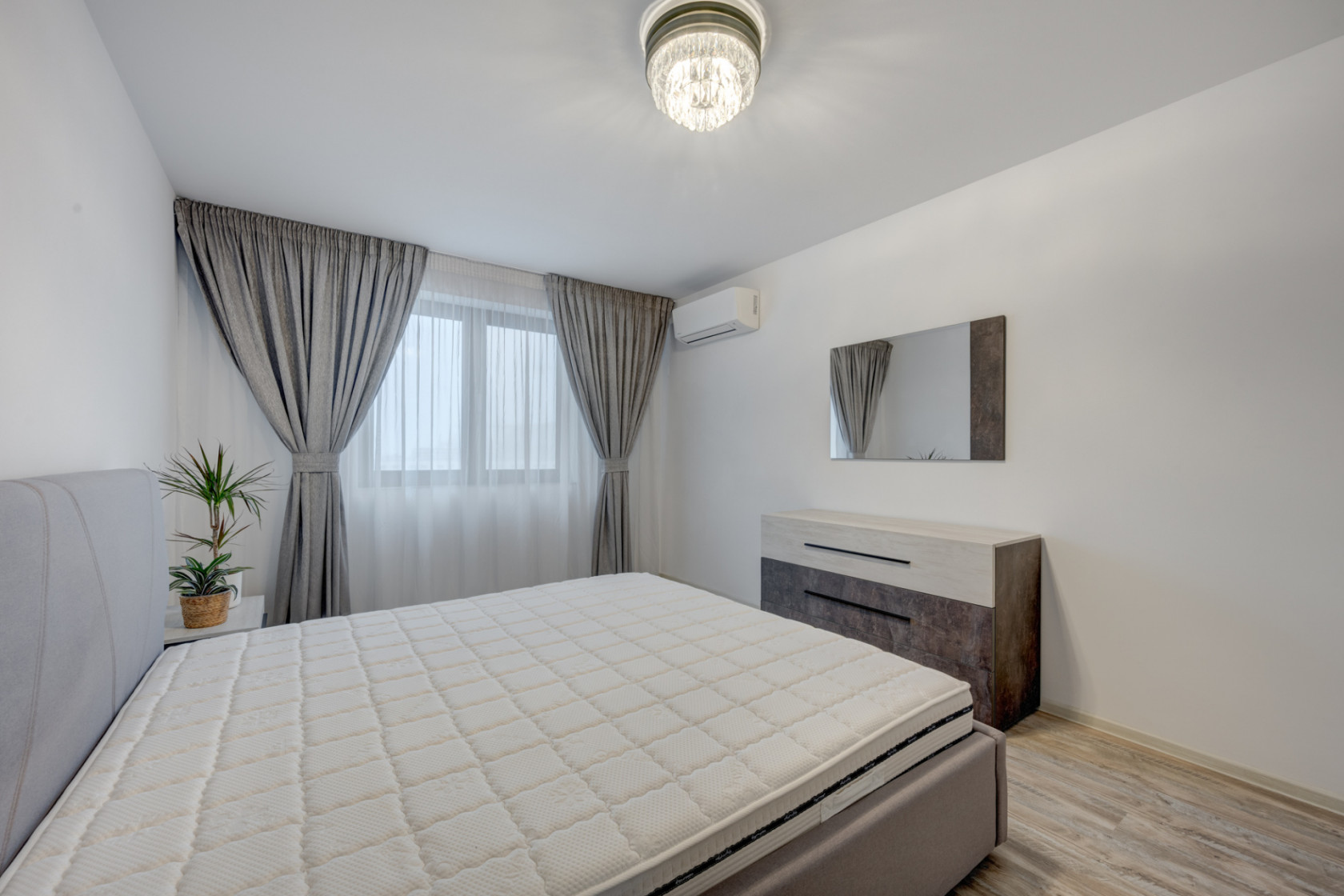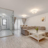 Locuința este compusă dintr-o cameră de zi spațioasă, cu ieșire spre balcon, bucătărie închisă cu perete de sticlă, dormitor de 17,50mp, dressing și baie cu cadă. Este complet mobilată și utilată.