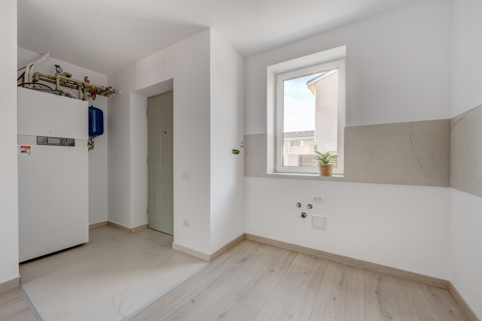 Parchetul de calitate, ușile albe, scara placată cu lemn, amenajarea băilor cu plăci ceramice de culori neutre, montate cu atenție, formează un tot unitar.